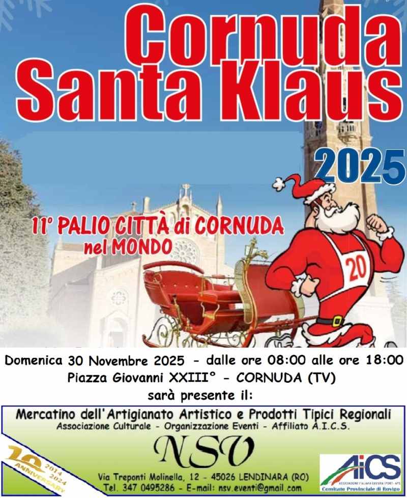 L'Associazione Culturale NSV Organizzazione Eventi APS affiliata A.I.C.S. - Comitato Provinciale di Rovigo, sarà presente in occasione della Manifestazione "Cornuda Santa Klaus" nella giornata di Domenica 30 Novembre 2025, a Cornuda (TV), in Piazza Giovanni XXIII° dalle ore 08:00 alle ore 18:00, con il Mercatino delle Tradizioni Popolari, dell'Artigianato Artistico e delle Opere d'Ingegno Creativo con curiose ed originali Idee Regalo Natalizie per la Casa ed il Tempo Libero con dimostrazioni pratiche delle tecniche di lavorazione sul posto, la rassegna dei Prodotti Enogastronomici Tipici Regionali ed Italiani con Degustazioni e Specialità Alimentari Dolci e Salate Stagionali prodotti artigianalmente per esaltare i Gusti e i Sapori di una tradizione antica ormai persa.