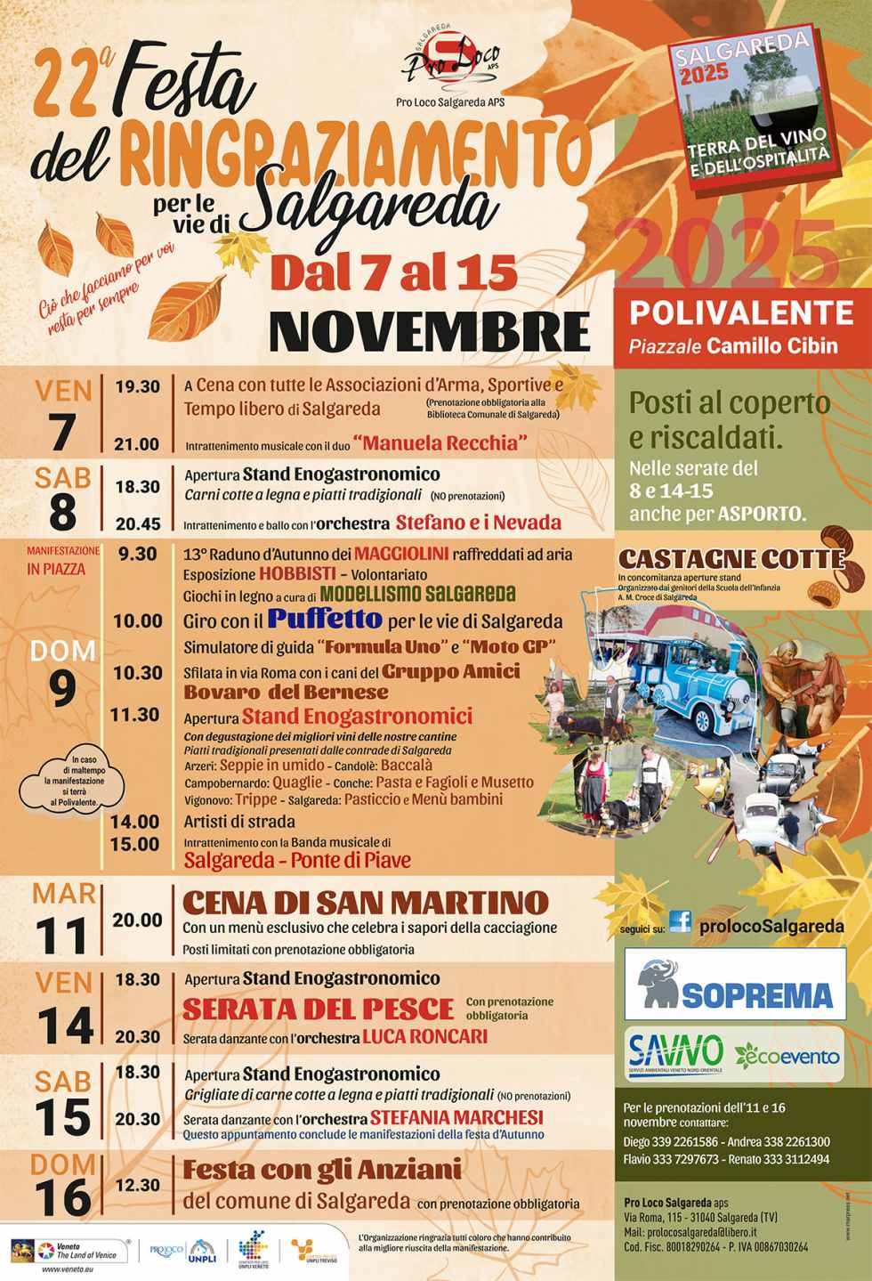 Dal 7 al 15 novembre 2025 le vie e la piazza di Salgareda si riempiranno di profumi, musica e tradizioni per la 22ª edizione della nostra amata Festa del Ringraziamento!