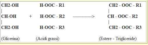 (esteri della glicerina con ac. grassi superiori) che, a temperatura ambiente risultano solidi. Sono definiti “OLI” quelle sostanze, di analoga composizione, che a temperatura ambiente risultano liquidi. Si riporta la reazione, generica, di formazione di un trigliceride.