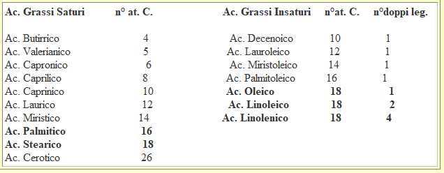 Si riporta una classificazione dei principali acidi grassi saturi e insaturi: