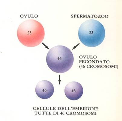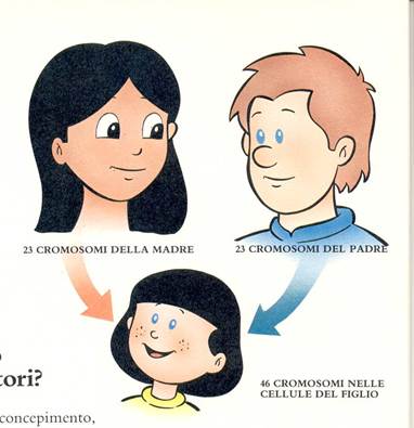 Fin dal momento del concepimento, i figli ricevono un’eredità biologica dai genitori. Ciò dipende dal fatto che sia l’ovulo materno che lo spermatozoo paterno hanno nel loro nucleo 23 cromosomi, portatori dell’eredità genetica della madre e del padre. Entrambi i gameti formano una nuova cellula, lo zigote, che ha già 46 cromosomi, come pure tutte le altre cellule umane che si formeranno via via da questo zigote. I cromosomi saranno cioè una specie di fotocopia dei gameti. E’ questo il motivo per cui noi figli abbiamo, chi più chi meno, tratti simili a quelli dei nostri ascendenti. La cellula uovo da cui proveniamo ha ricevuto informazioni genetiche da una cellula materna (ovulo) e da un’altra paterna (spermatozoo).